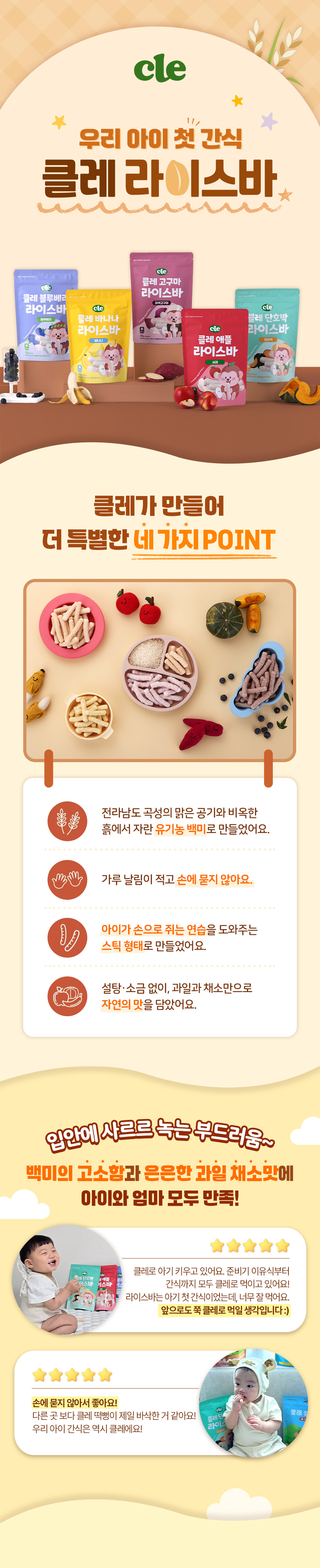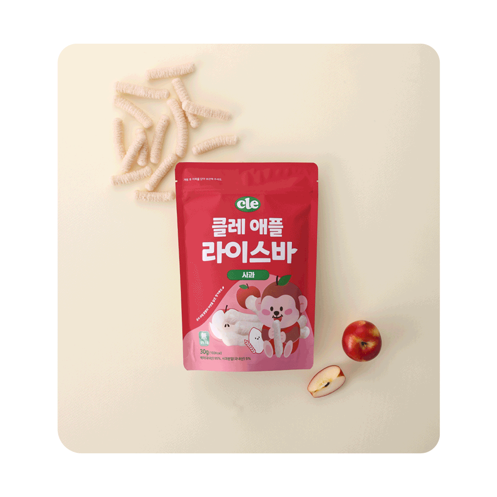 | 원재료명 및 함량 | 애플라이스바:유기농백미(국내산) 95%, 사과분말(국내산) 5% 바나나라이스바:유기농백미(국내산) 95%, 바나나분말(필리핀산) 5% 단호박라이스바:유기농백미(국내산) 95%, 단호박분말(국내산) 5% 고구마라이스바:유기농백미(국내산) 95%, 자색고구마분말(국내산) 5% 블루베리라이스바:유기농백미(국내산) 95%, 블루베리분말(미국산) 5% |