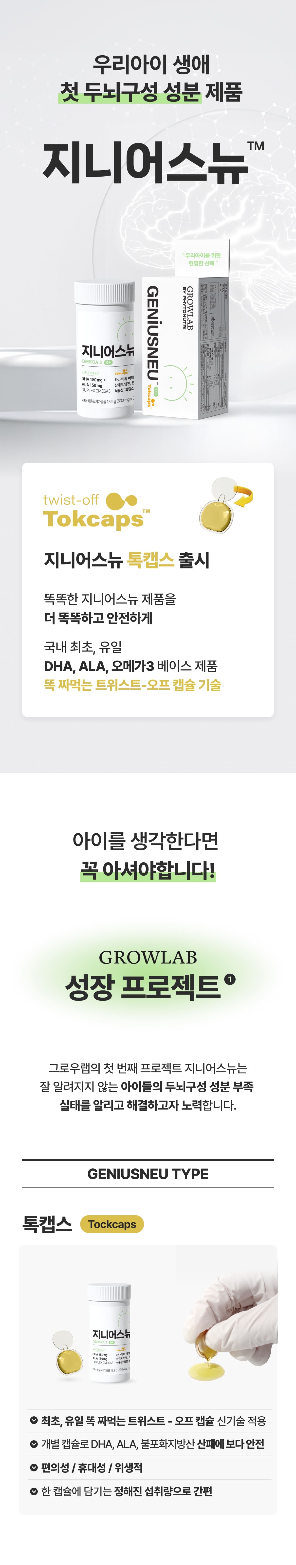 | 내용량 / 소비기한 | 지니어스뉴(톡캡스) 18.9g(630mg* 30캡슐) / 2027-06-19 [그로우뉴] 2000mg*30포(60g) / 2027-11-06 |